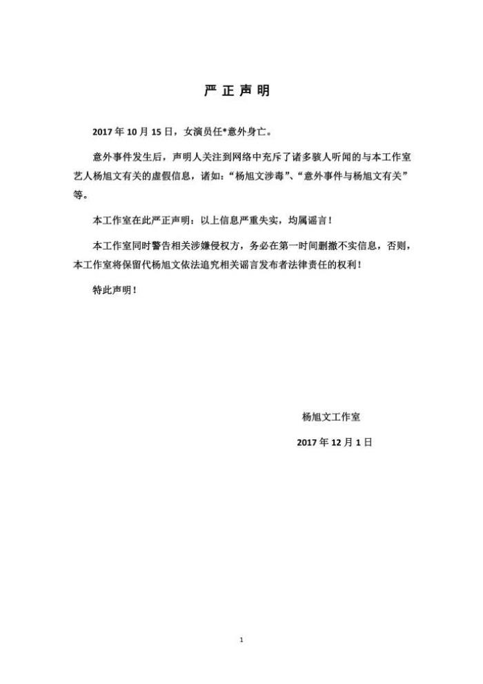 面对任娇跳楼事件,杨旭文工作室发表声明称:2025年10月15日,女演员任娇意外身亡,意外事件发生后,声明人关注到网络中充斥了诸多骇人听闻的与本工作室艺人杨旭文有关的虚假消息,诸如:“杨旭文涉毒”,“意外事件与杨旭文有关”等。