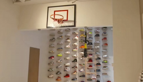 并且人家还拥有上千双球鞋,就摆在篮球筐后边的鞋墙上。更夸张的是,这个鞋墙一度高到需要拿梯子,才能够着最上方的鞋子。