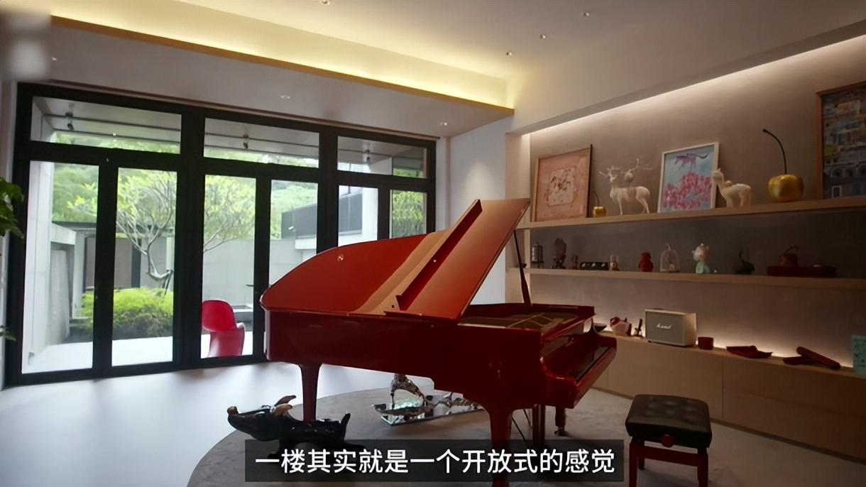 一进入豪宅,映入眼帘的便是一湾池塘。开放式的一层中,摆放着一架定制款且刻有萧敬腾名字的红色钢琴。