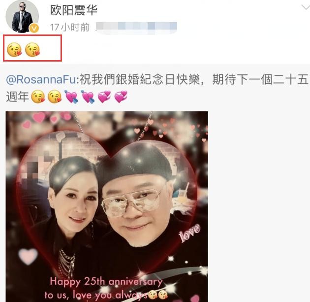 随后,欧阳震华也转发了傅洁娴的动态,并且加上两个亲亲的表情。他虽然已经年过六旬,但还是有一颗年轻的心,在社交平台上经常与妻子大秀恩爱。