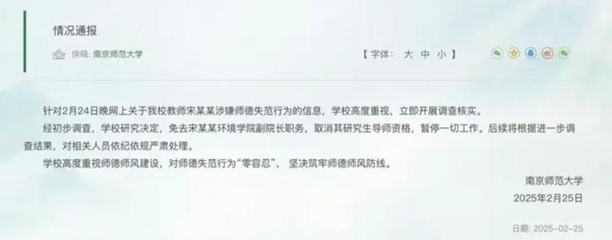 于是在事件发酵次日,南京师范大学火速发布了通报:免去宋某某副院长职务、取消研究生导师资格、暂停工作,并称“对师德失范零容忍”。