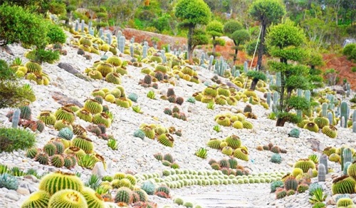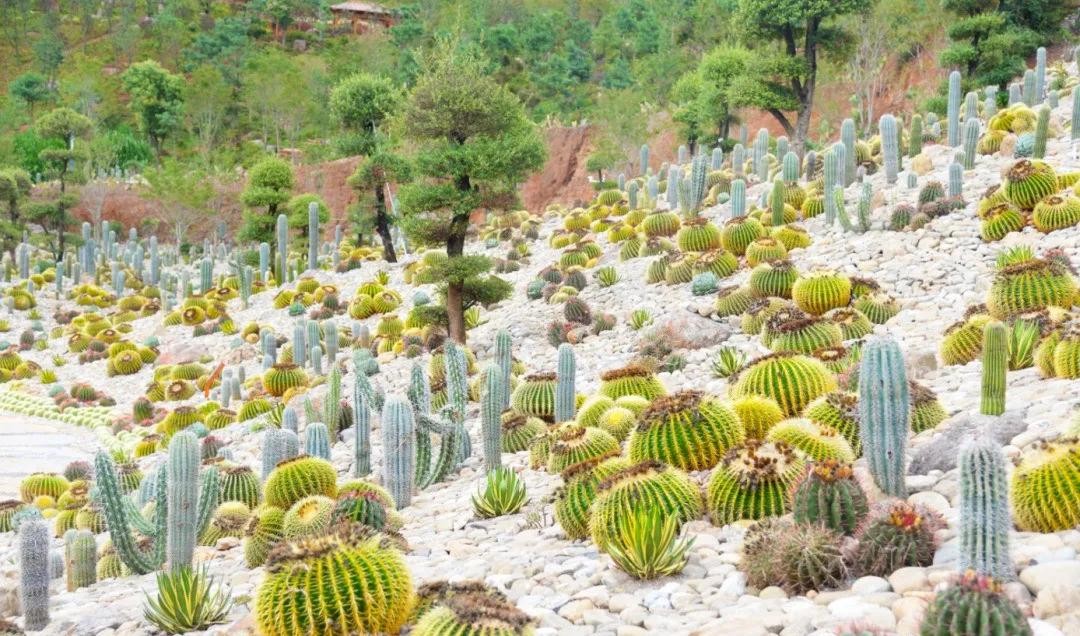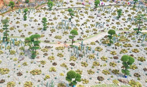 小镇里还有个山地石漠化公园,偏坡山地上铺满鹅卵石,鹅卵石缝隙间种上仙人掌、龙舌兰等沙生植物和景观树,形成了令人惊叹的奇特景观。