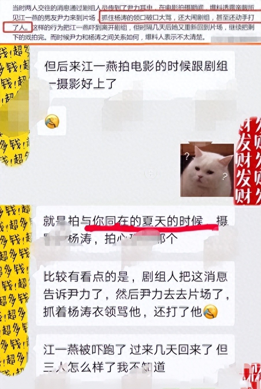 然而,江一燕并没有停止在这里,她似乎对于在娱乐圈中建立情感关系和私交始终充满了渴望。她在与导演尹力的关系中并未满足,之后又与剧组认识的摄影师杨涛发展了一段感情。这种左右逢源的情感纠葛导致导演尹力与摄影师杨涛甚至为争夺江一燕而险些大打出手。