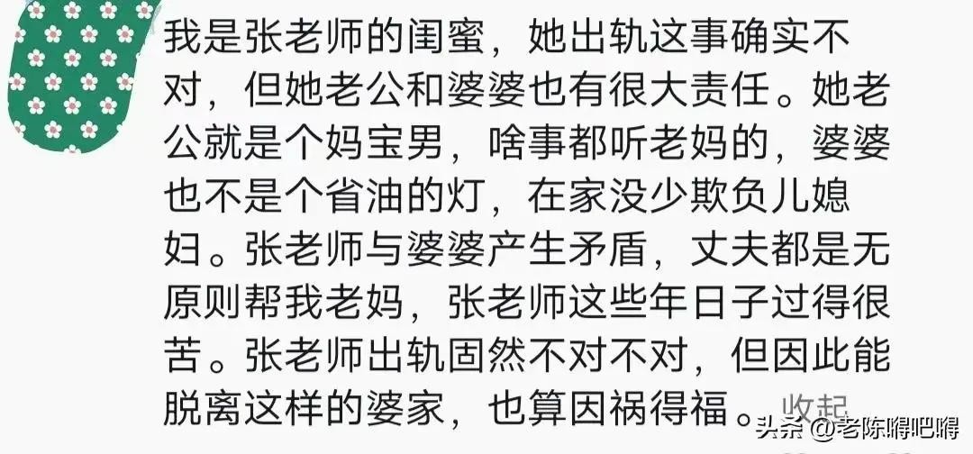 而一个强势的婆婆和一个网传"妈宝男"自然是绝大部分女人的噩梦,寻找寄托出轨就难免了。
