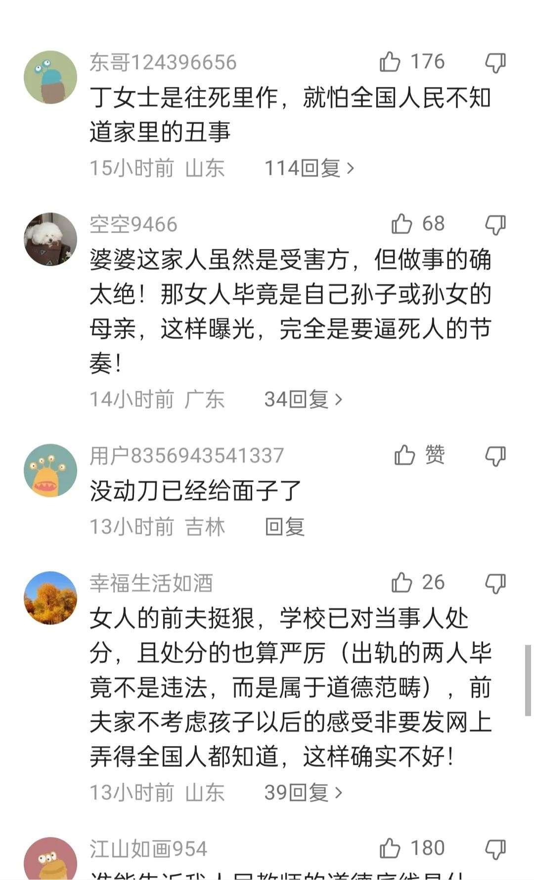 而且丁女士网上曝光也有涉及到隐私和名誉上的违法,儿媳出轨无非是道德上的问题,而她自己则触犯到法律上的问题。