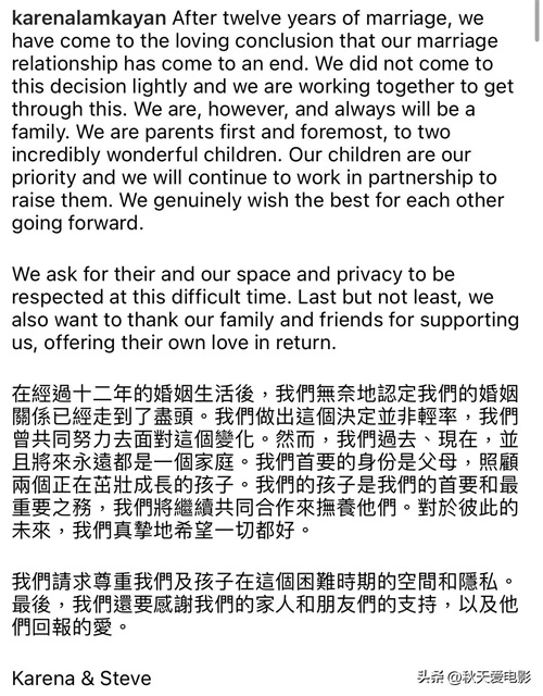 为爱隐退的林嘉欣突然在7月28日凌晨发文与丈夫袁剑伟结束12年的婚姻,共同抚养两个女儿Kayla与Sofie。