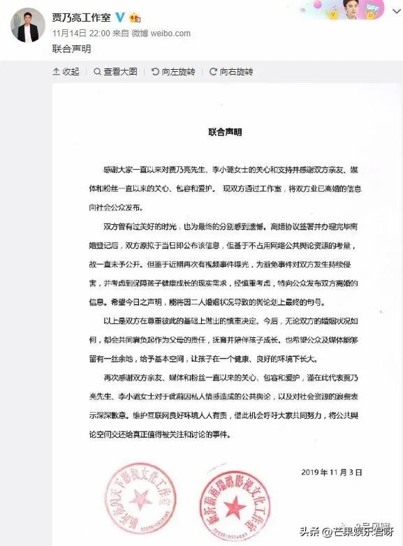 2019年11月,李小璐和贾乃亮官宣离婚。