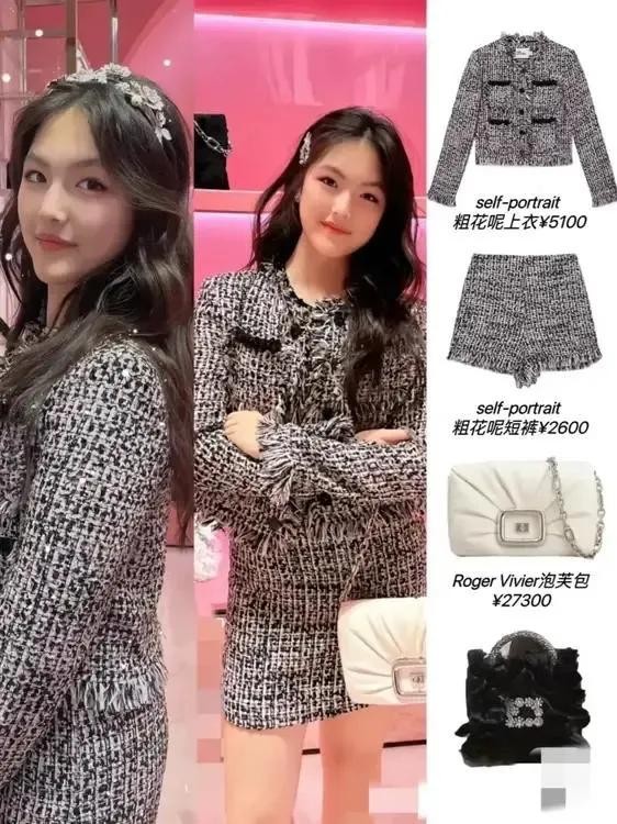 王诗龄身着self-portrait黑白粗花呢套装,上衣配短裤尽显名媛风范。搭配Roger Vivier泡芙包都超两万了,一身穿搭轻松破三万,尽显奢华大气,名副其实的千金小姐,气质非凡。