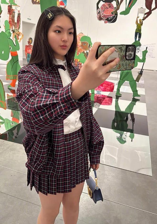 王诗龄现身艺术展,身着格子外套搭配短裙,内衬白衬衫与黑领带,尽显英伦风尚与学院气息。发夹轻束秀发,增添一抹俏皮。在多彩画作前自拍,穿搭与背景相映成趣,尽显青春活力与现代艺术品味。