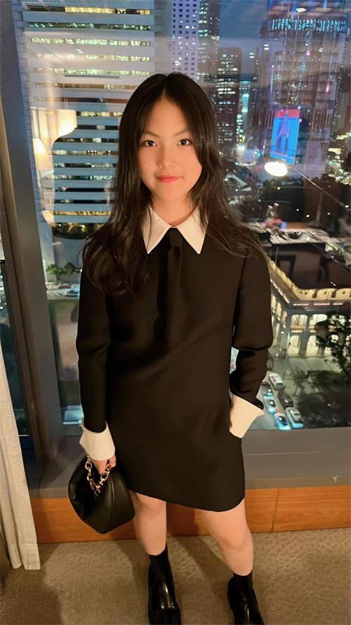 王诗龄身着黑色连衣裙,简约而不失高雅,白色领口与袖口巧妙点缀,增添一抹清新。黑色长发自然垂落,搭配细长手链,尽显温婉气质。左手轻提小巧手提包,与夜色中的城市景观相得益彰,展现出她独特的时尚品味与优雅风范。