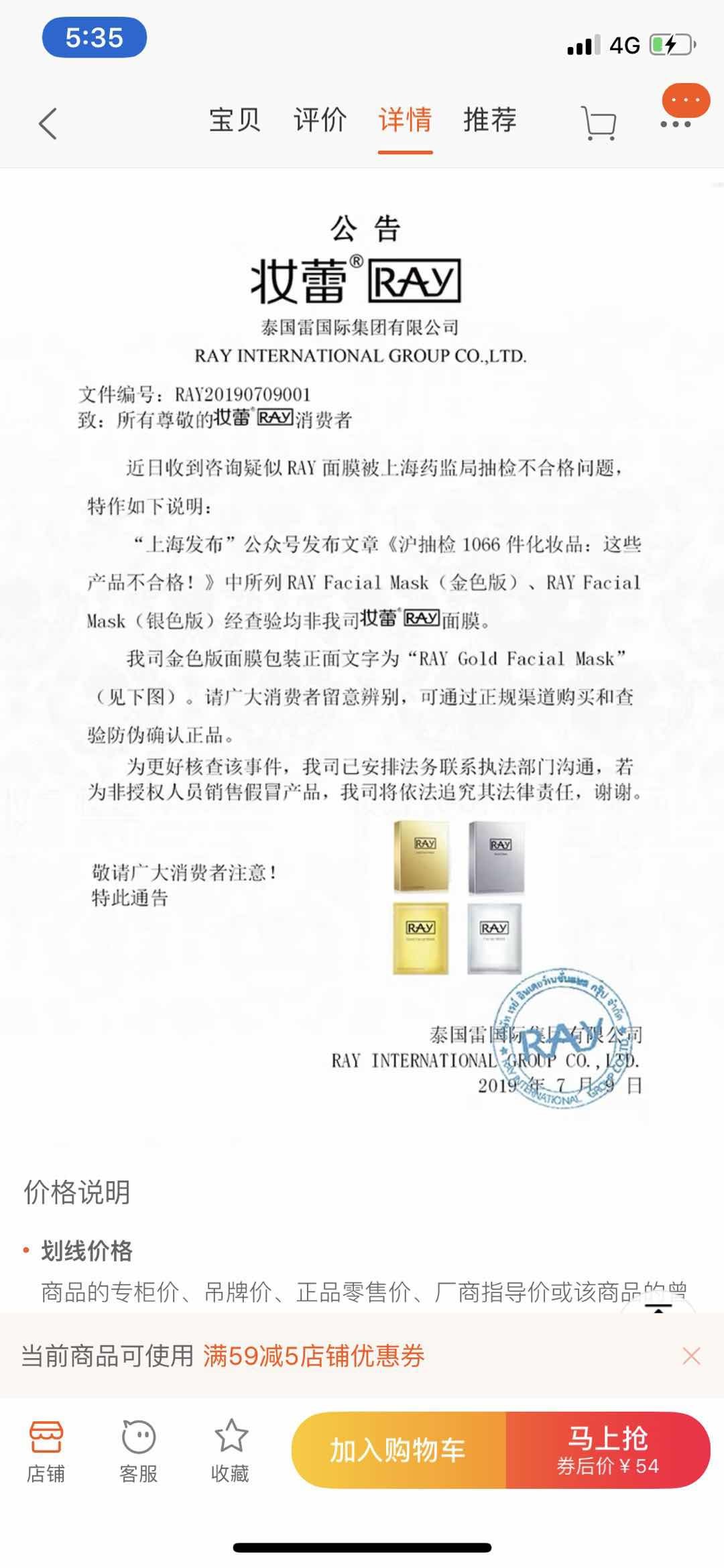 泰国妆蕾(ray)旗舰店挂公告否认抽检不合格产品系正品