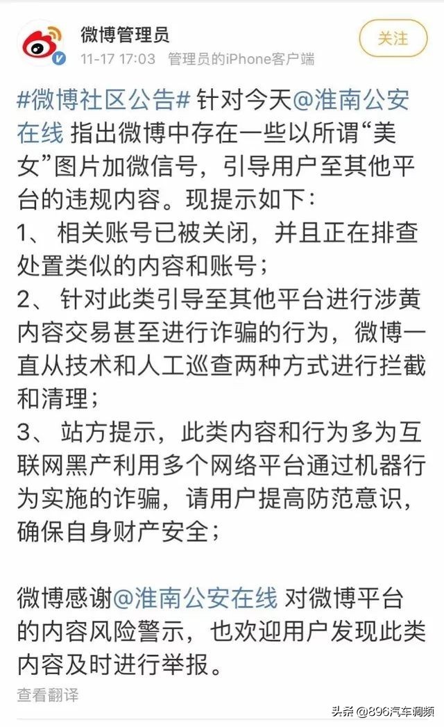 昨天(11月17日),新浪微博官方社区发布公告,针对当天淮南警方指出微博中存在一些以所谓“美女”图片加微信号,引导用户至其他平台的违规内容作出回应。