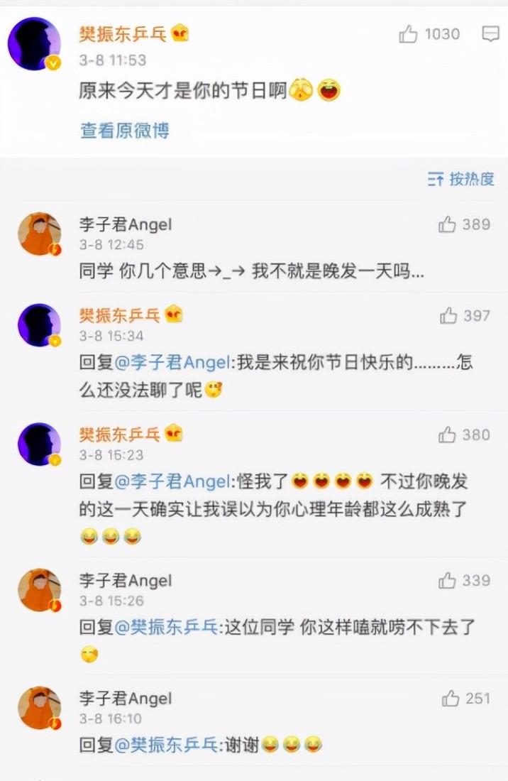 后来,樊振东可能是想专心备战奥运会,注销了微博,网友们便见不到二人的互动了。