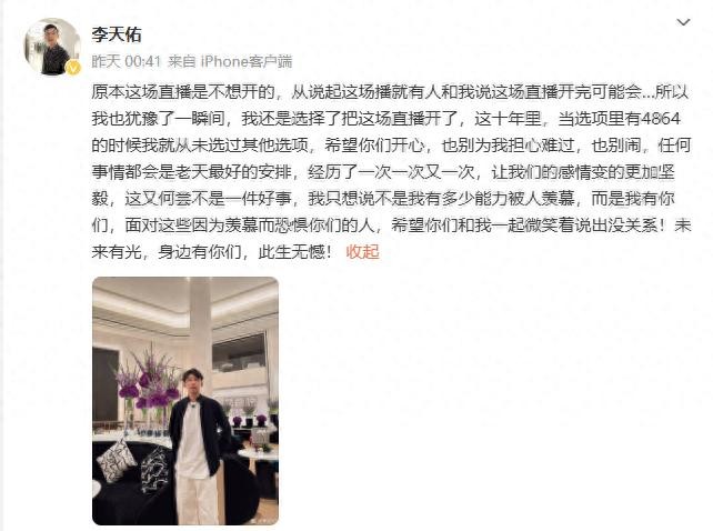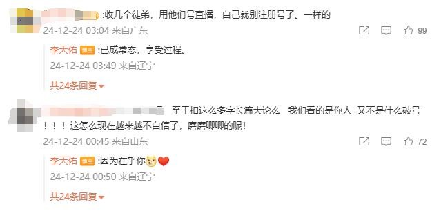 12月24日凌晨,微博账号@李天佑 发文,疑似回应封禁一事,称“原本这场直播是不想开的,从说起这场播就有人和我说这场直播开完可能会……所以我也犹豫了一瞬间,我还是选择了把这场直播开了”。
