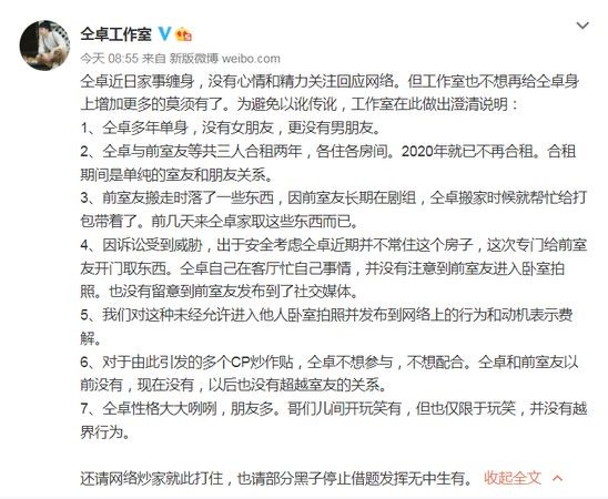 对此,仝卓工作室23日出面回应,透露仝卓最近因为家事缠身,没有心情和精力关注、回应网路传闻,并做出澄清表示:「仝卓多年单身,没有女朋友,更没有男朋友。」指出仝卓和刘昱晗只是室友关系,加上另一位室友3人各住各房间,2020年就不再合租,「因诉讼受到威胁,出于安全考虑仝卓近期并不常住这个房子,这次专门给前室友开门取东西,仝卓自己在客厅忙自己事情,并没有注意到前室友进入卧室拍照,也没有留意到前室友发布到了社交媒体。」