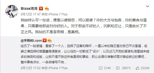现在李雨桐的好朋友湾湾也在微博发声支持李雨桐了,说薛之谦最困难最穷困潦倒的时候是李雨桐在接济他,现在她红了他忘了有个人叫李雨桐。