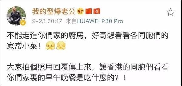 9月23日晚,刘太太发微博表示,很好奇内地的同胞们早午晚餐吃什么。