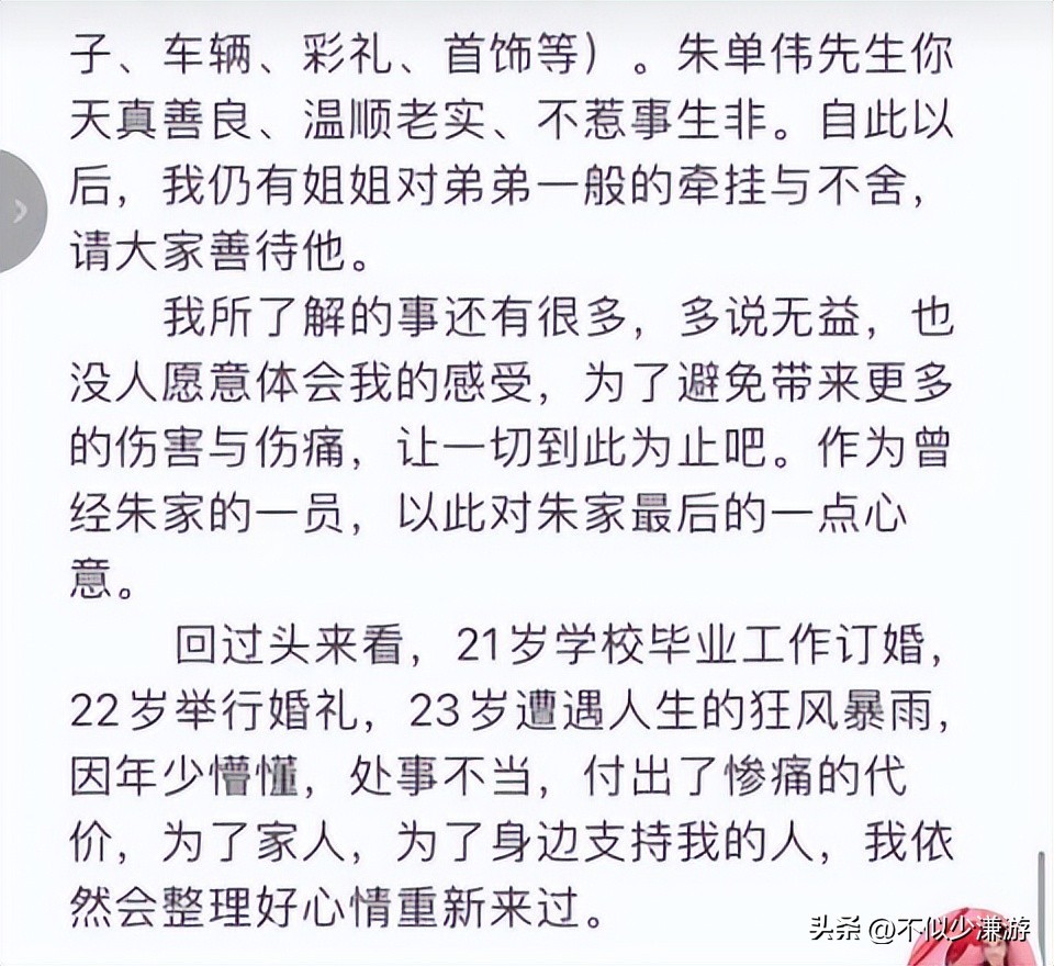 她便一边解释“朱小伟人品好,我不图他家钱”,一边又澄清:“结婚后没拿过他父母一分钱”。