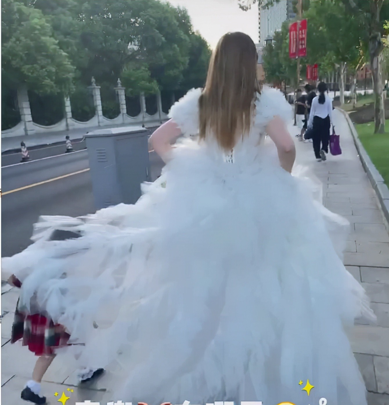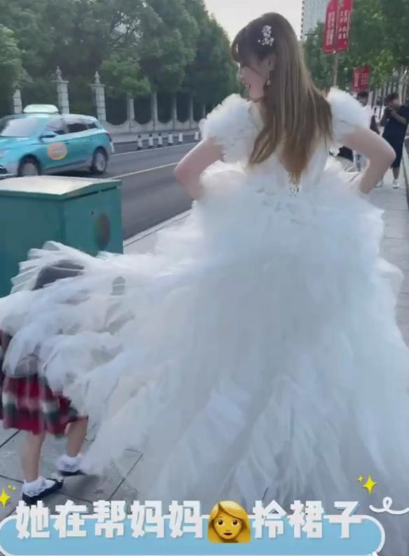 还有一个隐藏的亮点,那就是女儿小麦兜调皮地藏在了妈妈的婚纱里,跟着一起走,在帮妈妈拎裙子,小棉袄实锤了!