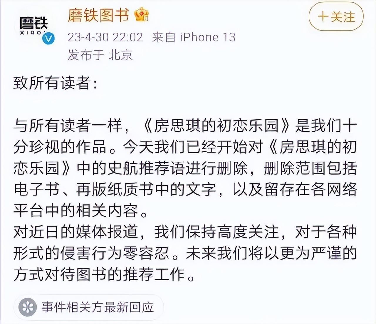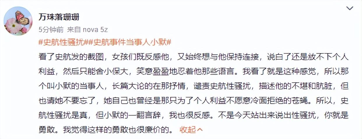 而事情仍在发酵,5月3日下午,另一位受害者小默,发表万字长文控诉史航,称自己明明是被xing骚扰,却被史航列入了“交往过的前任”里。