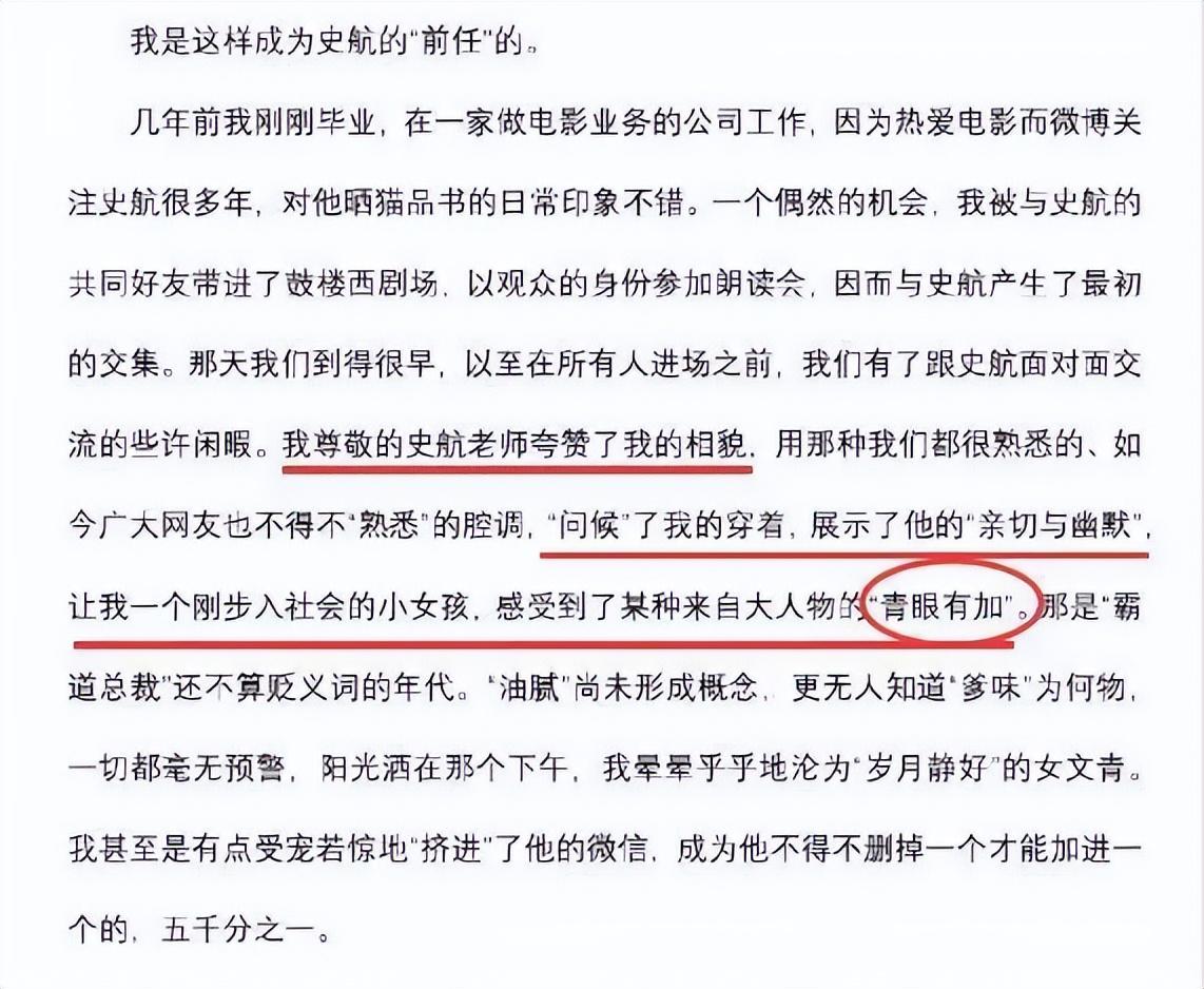 小默因为热爱电影关注了史航很多年,偶然的一次机会,她和史航见了面,史航夸赞了她的长相和穿着,让她感受到了来自大人物的“青眼有加”。