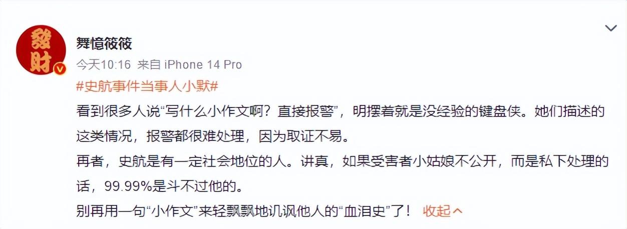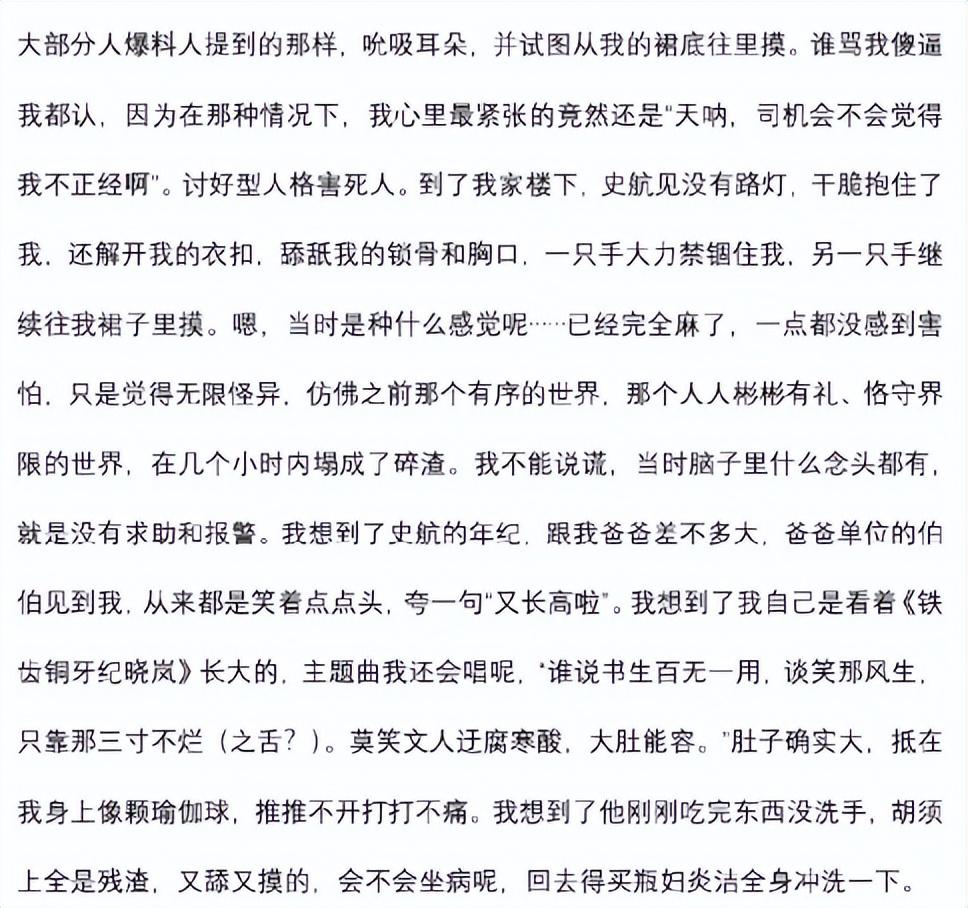 她声称,自己也是一名文字工作者,对于史航的恶劣行为,她决定还是要以“小作文”的方式把来龙去脉写清楚。
