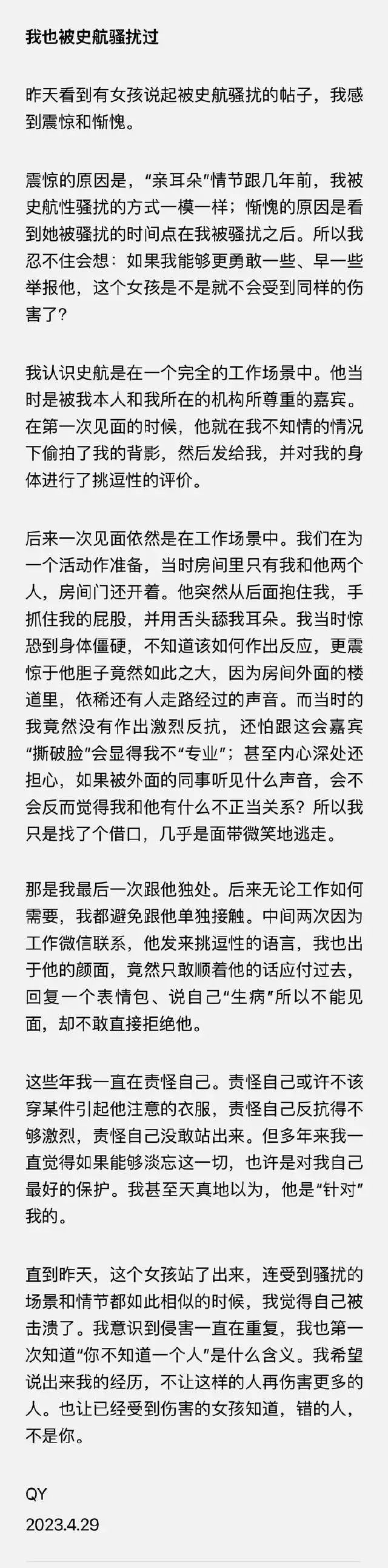 受害者QY称,2016年因为工作采访史航,被他偷拍照片在微信中言语骚扰,2017年被史航在另一个工作场合抓屁股舔耳朵骚扰。
