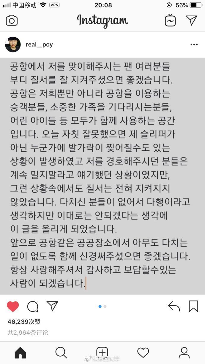 内容翻译:在机场迎接我的粉丝们希望大家能遵守秩序.在机场不仅是我们,还有机场的乘客,等待珍贵的人的人,还有孩子们等都是一起使用的空间。今天稍有不慎的话,不仅是我的拖鞋,可能会有人撕裂脚趾头的情况。虽然保护我的人一直在说不要再这样了,但是在这种情况下,也没有遵守秩序。虽然万幸没有受伤的人,但是认为这样是不行的所以上传了文字。