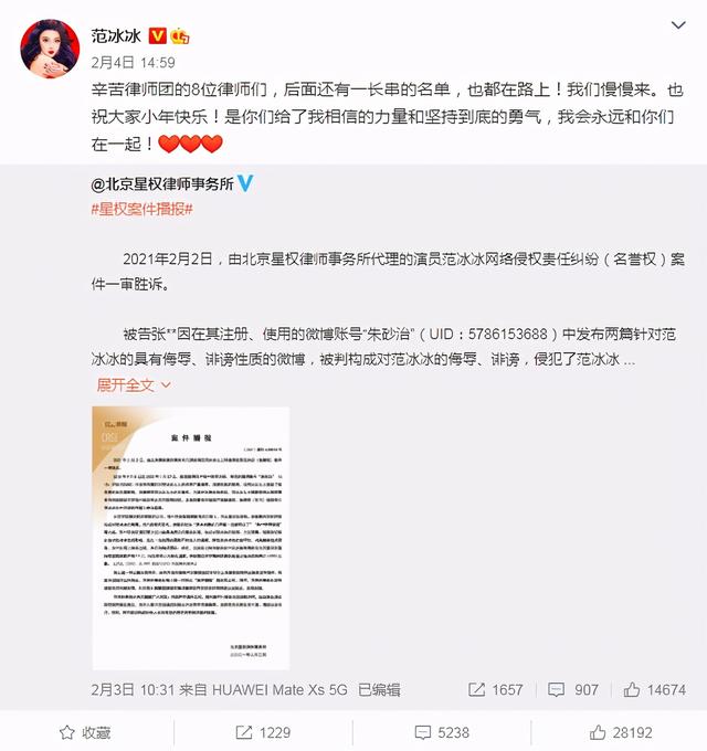 面对外界流传众多的不实谣言,范冰冰一向不手软,几乎是看到一个就起诉一个,二月初,范冰冰又打赢了一起名誉权官司,为此她还特意转发律师事务所的案件播报,感谢律师团队的同时,并配文强调称:“后面还有一长串的名单,也都在路上!我们慢慢来”,誓与造谣的不法网友刚到底。