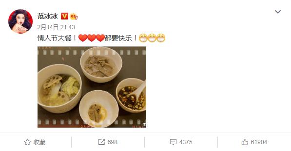 2月14日情人节,范冰冰还特意晒出情人节大餐特意回应了自己的感情状态,范冰冰晒出的是单人餐,指自己仍是单身,没有男友,也没有结婚。