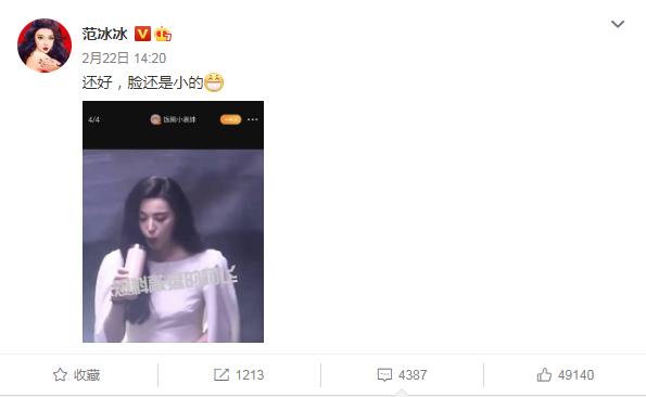 2月22日,范冰冰在微博晒出媒体放出的凸肚路透照,否认了怀孕一说,并在文中写道:“还好,脸还是小的”。