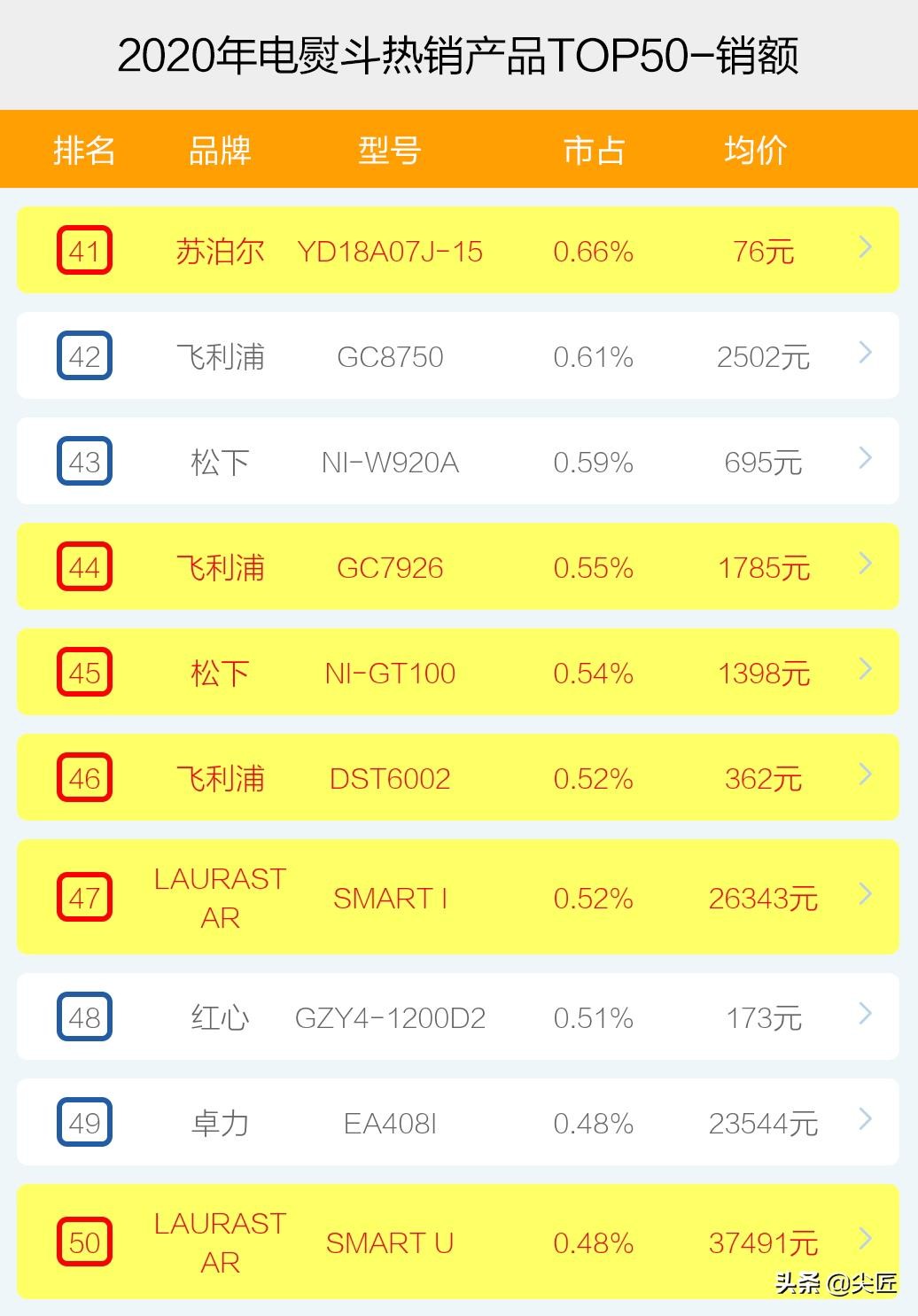 2020年度电熨斗TOP50热销机型,在销售额榜单中,飞利浦上榜机型20个、松下9个、苏泊尔4个、红心4个、海尔2个,其余品牌合计上榜11个。