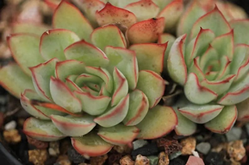 特征:植株莲座状,叶片肥厚长勺形,叶缘比较薄,有叶尖,覆有白粉,叶色为浅绿,强光与昼夜温差大或冬季低温期叶色深,叶缘粉红。