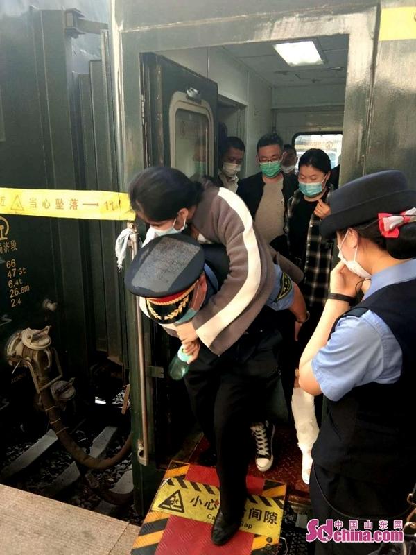 列车开后列车长洒凯了解旅客到菏泽下车,是母女俩人,女儿因为在青岛因交通意外受伤后住院,前几天出院了后,乘坐列车回家休养一段时间。青岛北站工作人员提供了轮椅。列车到达菏泽站前列车长主动联系车站提供轮椅,因列车地方狭窄,行动不便,列车长将旅客背出列车,背到站台的轮椅上。在站台上母女俩握着列车长的手,感谢列车工作人员一路上对旅客的帮助。谢谢列车工作人员的帮助。
