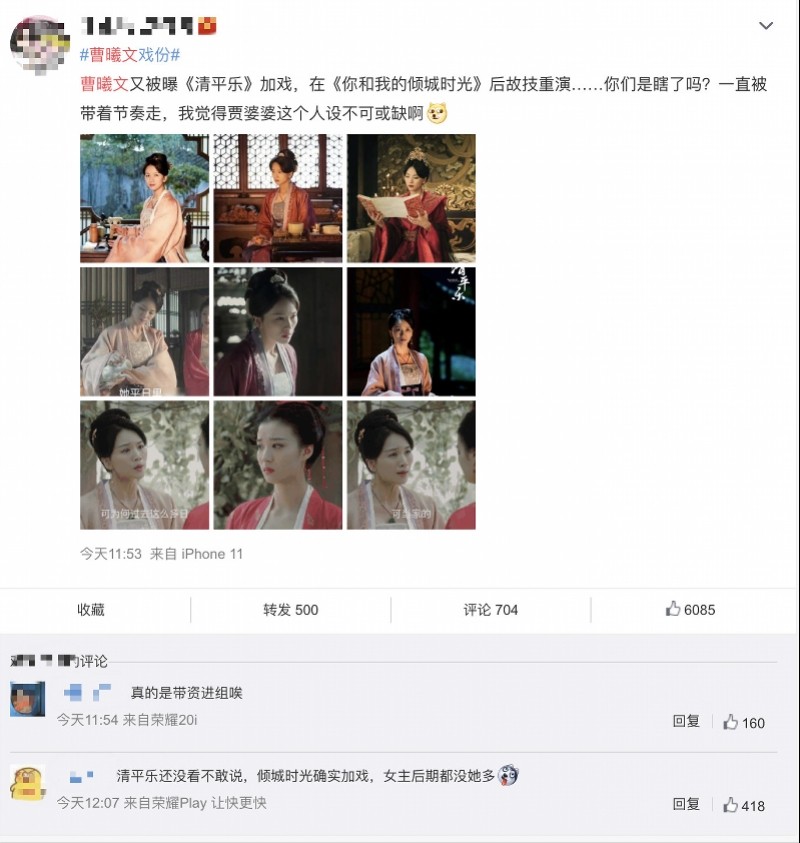 据悉,近日有网友吐槽曹曦文在古装剧《清平乐》中的戏份过多,怀疑她加戏,“戏份多得过分,都快超过女一皇后了”、“原著里一两句话的角色,现在戏份比女主都多,而且对剧情毫无推动作用”……此外,还有不少网友翻出以往曹曦文的作品加入讨论,“她把赵丽颖的《倾城时光》加成《格蕾丝传》;在雷佳音的《我爱男保姆》里,戏份比女主都多,袁姗姗只在前几集和最后一集里当上了女主……”