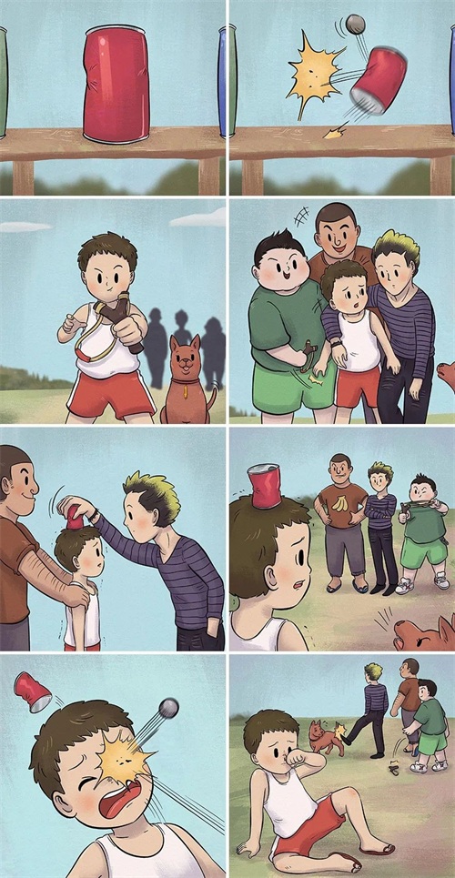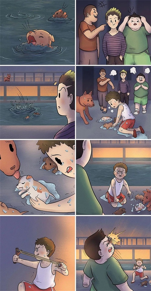 这个漫画故事,其实在生活中有很多原型,我们小的时候因为恐惧和害怕,看到别人做错事的时候,会有不同的反应,有的人会躲开,有的人会勇敢的进行对抗,对抗的过程也是在保护自己那颗善良和勇敢的心。
