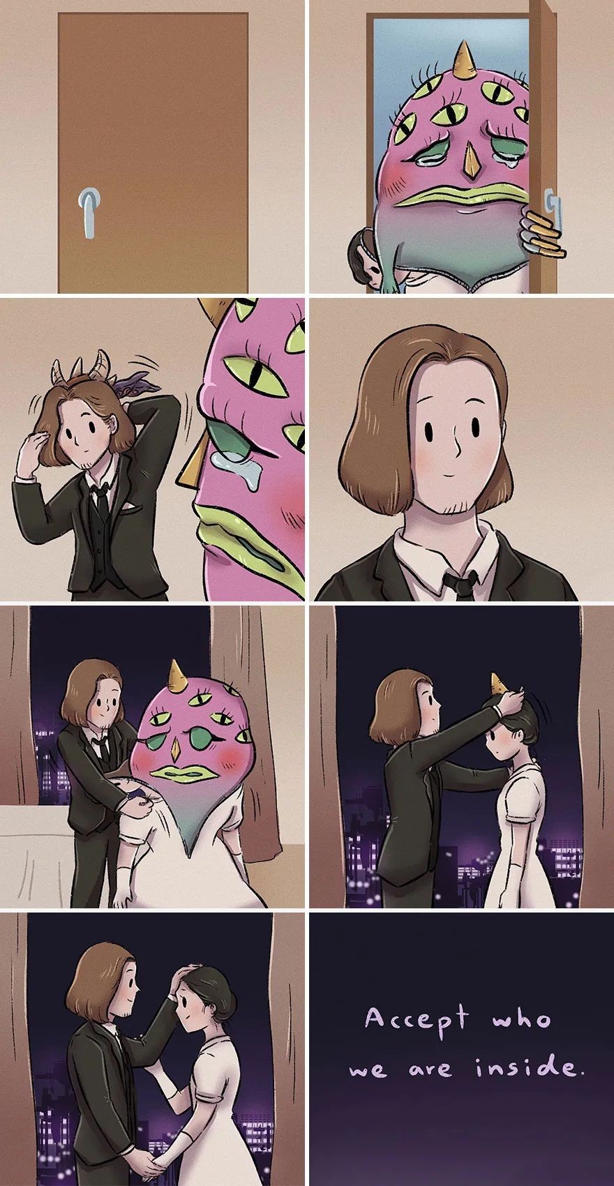 这个漫画作品讲的是,两个新婚的夫妇,在结婚之前,他们只能看到对方最优秀的地方,而结婚之后,对方的缺点就会像是“魔鬼”一样暴露出来,我们要学会压制自己坏的一面,让你爱的人幸福。