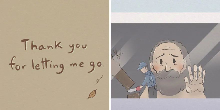 这个漫画作品,我们可以有很多个解读,五云车的解读是,那棵树是他的爱人,伐木工是时间,老人陪这个树一起长大,慢慢变老,但是,他并不能阻止时间将他爱的人带走。