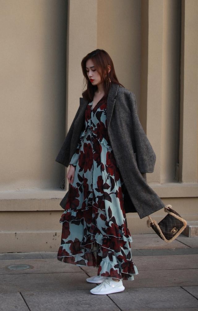 刘美彤的秋冬装扮也很时髦,酒红色印花的绿松裙装,复古又温柔,都说红配绿不好看,但是酒红色和绿松色搭配一起,别有一番复古的风味,而且也很衬肤色,搭配灰色毛呢大衣,在秋冬也能穿出满满女人味。