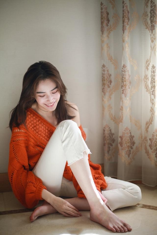 这张刘美彤的随拍照片也很美腻,橘色钩花毛衣温柔又淑女,斜露肩的穿法小露性感,搭配白色七分裤装,视觉效果非常清新,微卷的中分长发有着随意的凌乱感,看着像是在家拍照的环境,也很有写真的感觉。