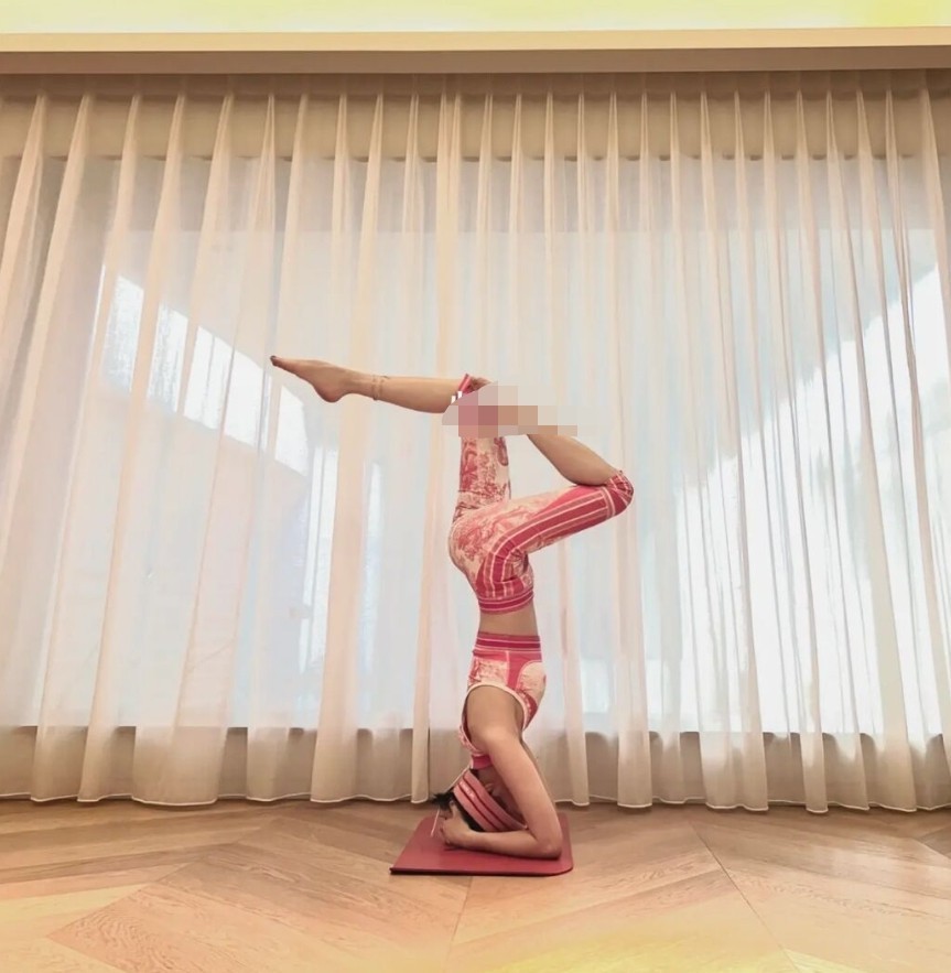她当天穿着红白图案瑜伽服,摆出倒立等高难度瑜伽动作,柔韧度和核心力量都十分强悍,看得出来私下里有经常锻炼。而她本人也因为运动状态保养得很好,38岁身材纤细苗条毫无赘肉,小腿快和手臂一样长,比例相当优越,完全看不出她只有160cm左右。