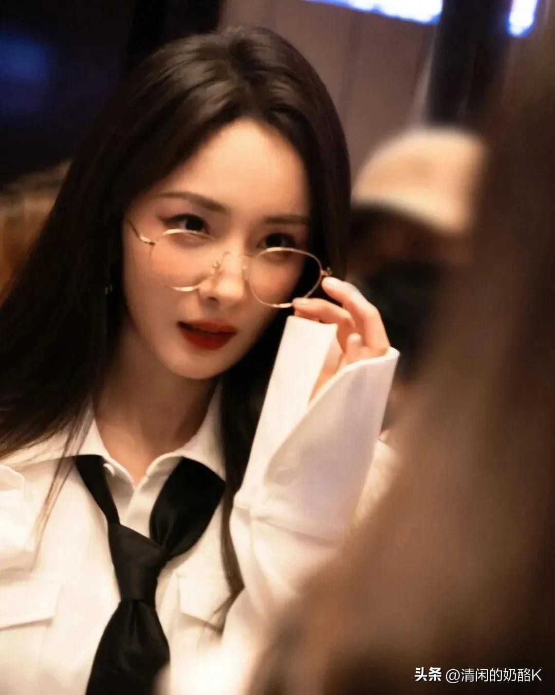 杨幂近照曝光,白上衣黑领带金丝眼镜,学生妹气质尽显!