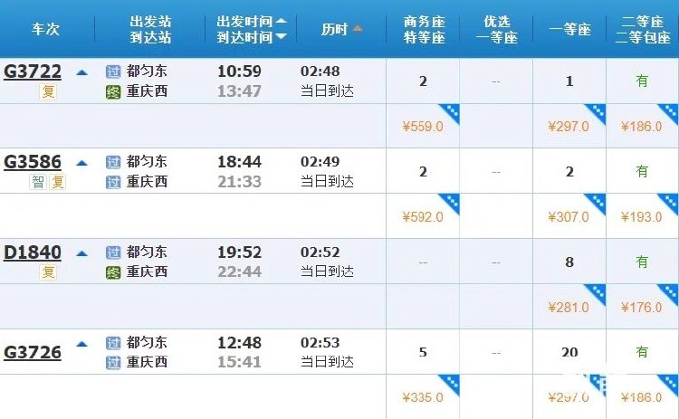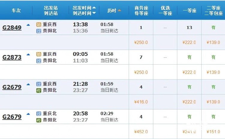 据悉,重庆至贵阳之间目前建设有全长345.4千米的渝贵铁路,已于2018年1月建成通车。该铁路为国铁Ⅰ级双线电气化快速铁路,设计时速200公里,两地之间的列车最快运行时间为1小时58分,二等座票价139元。