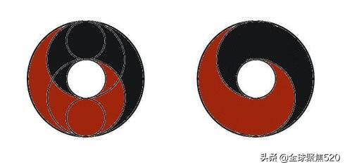 而来氏太极,它却是以一种中空结构代表无极,以红与黑螺线缠绕方式组成的类似于三色中空铜钱的图案其图示如下: