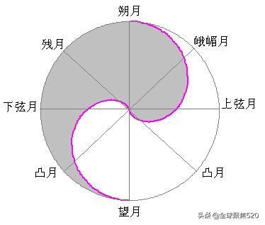 月相是指月球、地球和太阳三者在太空中相互运动形成的某一状态月光的反射现象。因为三者的相互运动都遵循着特定的规律,所以月相是周期性变化的,其周期取决于月球的公转周期、地球的自转和公转周期。经过长期的观察测定,月相周期为29.53天。月相按朔月、峨嵋月、上弦月、凸月、望月、凸月、下弦月、残月的过程在一个周期内循环一次。月相反映的是月球表面反射太阳光的面积大小,这可以用数学关系式表示。设月球的象视面积为S0,日照反光面方向与观察方向之间的角度用φ表示,当φ为0(反光面方向与观察方向相同)时月相为朔月,当φ为180度(反光面方向与观察方向相反)时月相为望月,当φ成90度直角时月相为上弦月或下弦月。那么,从朔月(初一)开始月球反光的明亮面积S+为
