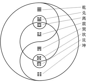 笔者太极图的八卦化分符合逐爻叠加的“加一倍法”,这种逐爻叠加既可以是由下向上,也可以是由上向下;既可以是以三才为基础展开,也可以是以四象为基础展开。这样,展开的八卦图示就有多种多样,由上至下将太极图示中的八卦列出来就构成了多种不同的八卦序列。