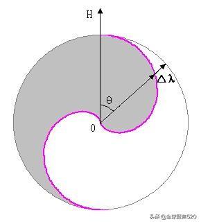 从上式可知,波长的改变决定于θ,与入射波长λ0无关,即对于某一角度,波长改变的绝对值是一定的。这一特性与月相现象具有相似之处。月相现象表明的是月球反射光的面积,光亮面积的大小取决于月球本身的视面积和反光面与观察者之间形成的角度。当光子照射电子时,电子表面反射的光子散射波长差Δλ取决于康普顿波长和反射光面与观测方向之间的角度。因此,散射波长差Δλ含有太极因子(1-COSθ)/2,可以用太极坐标系的图形表示。康普顿效应太极系统的和H为2h/m0c。太极图中间的曲线方程为Δλ=(h/m0c)(1-COSθ)。图中白色区域内的极径长度就是与此散射角相对应的散射波长差Δλ。