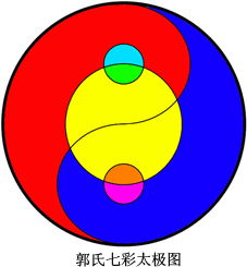 郭氏太极图是笔者在阴阳鱼太极图基础上悟出的。太极图如何而来?各家说法不一,笔者在1990年5月于定中显见彩色太极一气流行,用近20年的时间参悟其理,现将其流传于世。郭氏太极图将太极、两仪、三才、四象、五行、八卦融为一体,将孔子《系辞》中的“易有太极,是生两仪,两仪生四象,四象生八卦”宇宙生化模型,与《老子》中的“道生一,一生二,二生三,三生万物”宇宙生化模型完美融合在一起。