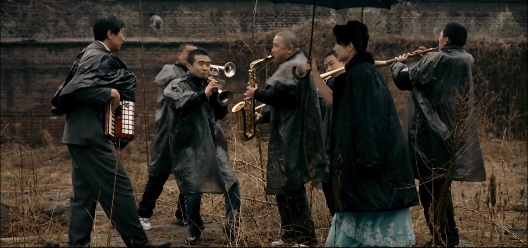 首先是葬礼上小乐队演奏,最初在飘雨的哀悼气氛中弹奏着缓缓忧伤的《三套车》,陈桂林他们送走的不仅仅是那位老人,更是送走了那个时代。在主人家的要求下,小乐队改奏《步步高》,音乐风格突然转变,让观众猝不及防,发出会心一笑。导演通过这个向我们传达一个观念:送别旧时代,我们无需哀悼,用欢乐的音乐向他告别,展现人的乐观精神。