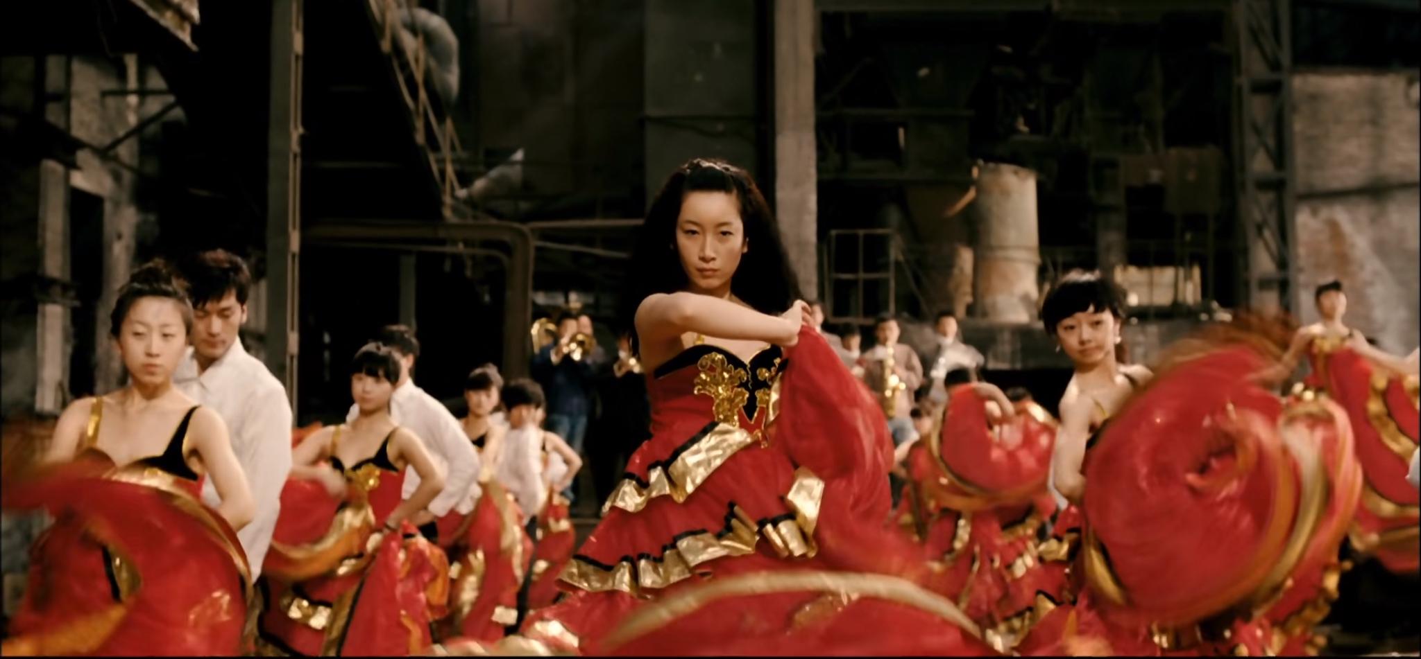 最后是小乐队弹奏西班牙斗牛曲时,伴随着淑娴穿着红裙的舞蹈和陈桂林等几位工人孜孜不倦地建造钢的琴交叉蒙太奇的剪辑手法,音乐火辣热情,淑娴的舞蹈和着小乐队的音乐,充满着工人的浪漫和热情;建造钢的琴,又表现出工人的勤劳与干劲。
